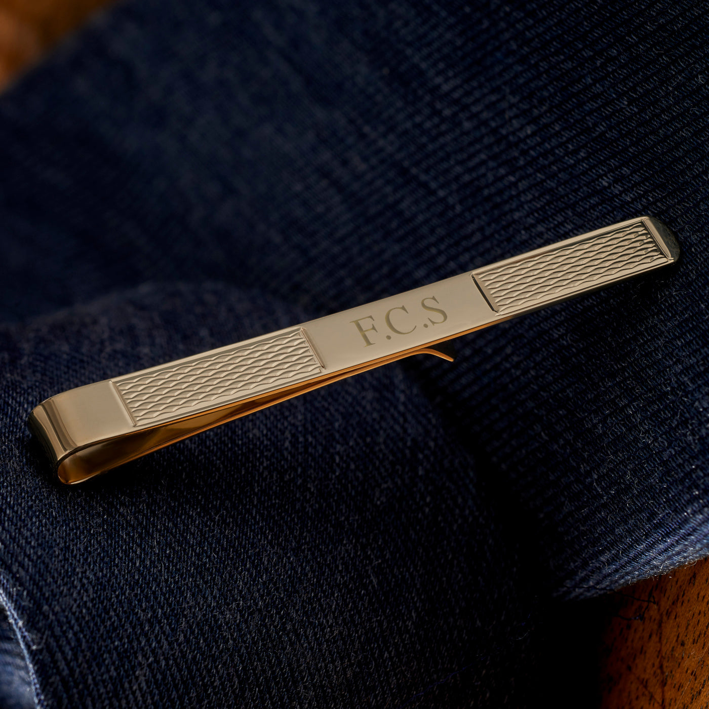 Engraved solid 9ct gold tie slide, fantastic quality shown throughout. The perfect personalised accessory to add that touch of class to your attire. Engrave upto 3 characters (please add full stops between the initials if required). Gift box included in sale. Dimensions - 55mm x 5.5mm