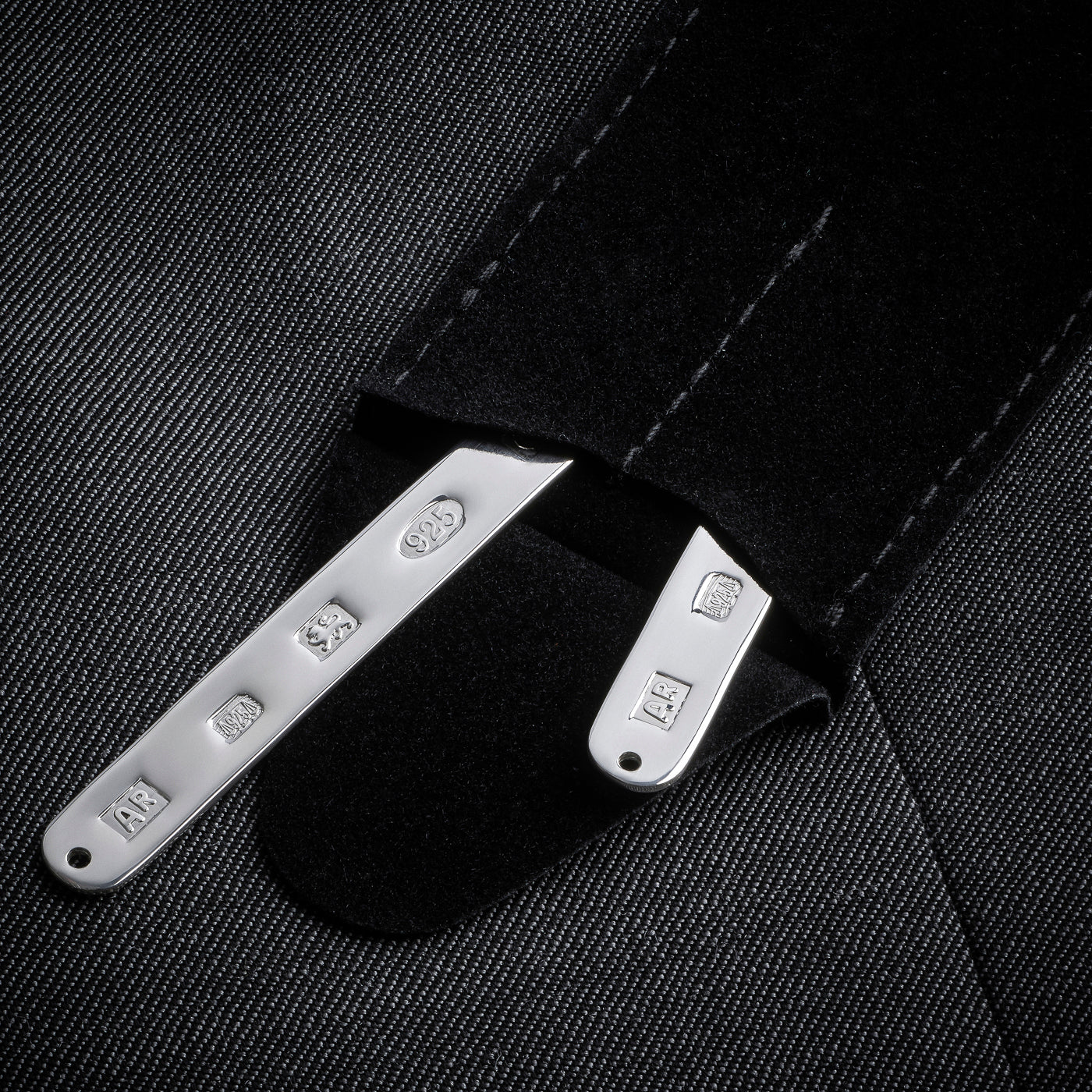 A pair of feature hallmarked sterling silver collar stiffeners, each one measures 65mm x 7mm (standard size), made in house by hand at our U.K jewellers. Delivered with a high quality collar stiffener pouch.