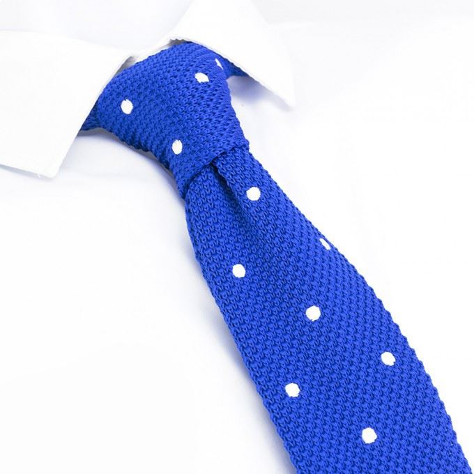 Royal Blue Polka Dot Knitted Square Cut Tie - This classic knitted tie is made using a microfibre blend and is hand finished to perfection. Featuring a Royal Blue base with White polka dots. Tie Dimensions: 148cm x 5.5cm
