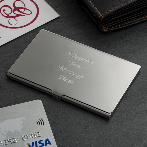 Classic design - holds 8-10 standard business cards or 3 credit cards. Supplied with pouch and envelope.� Design your own message to the maximum of 120 characters. The text is always centred and done to a professional standard. Please take care to proof read the message as the work is bespoke and unrefundable. Dimensions - 92mm x 60mm x 5mm