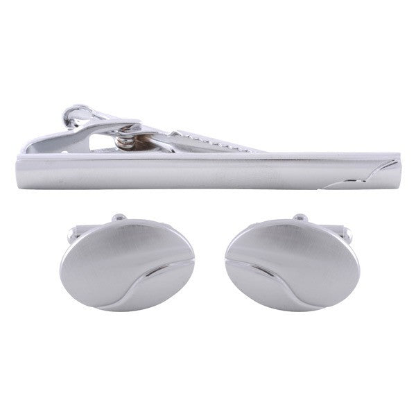 Cut Lined Silver Cufflinks & Tie Bar Set