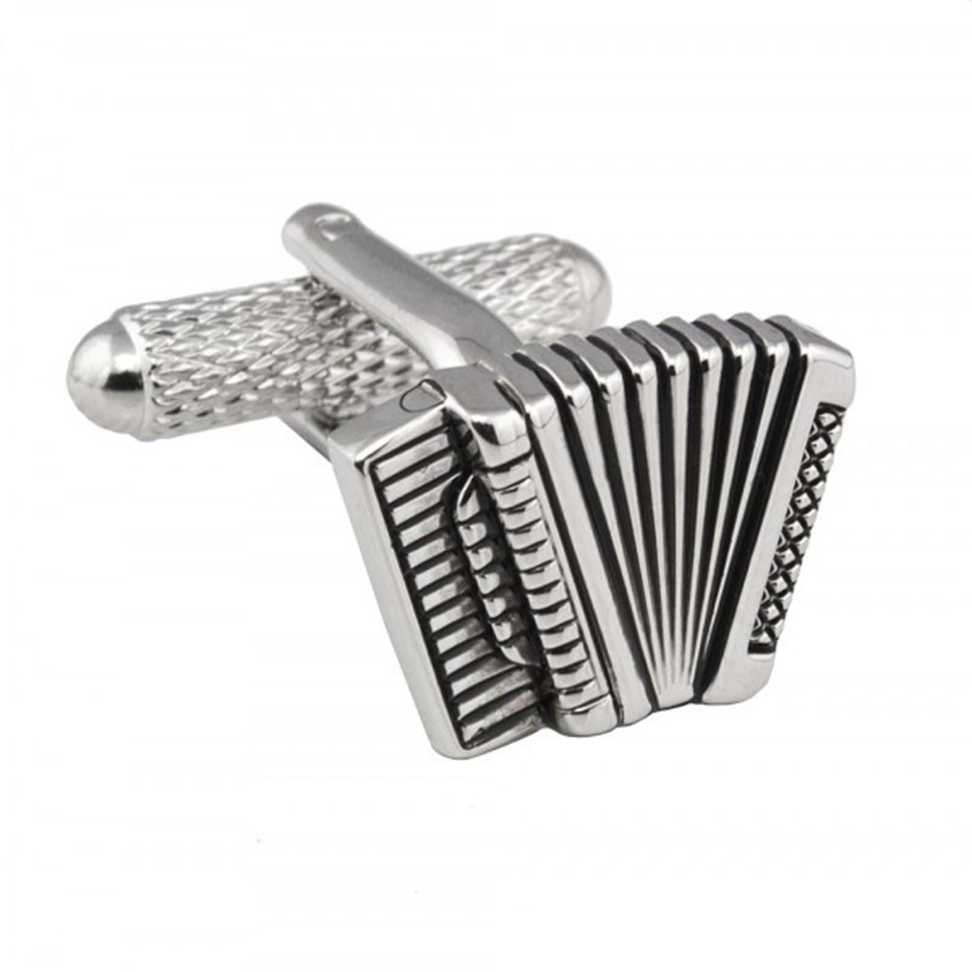 Accordion Cufflinks. Handcrafted to exceptional detailing, rhodium plated set on a strong swivel clasp. Cufflink box included in sale but if buying as a gift why not upgrade to an engraved box to include a special message.