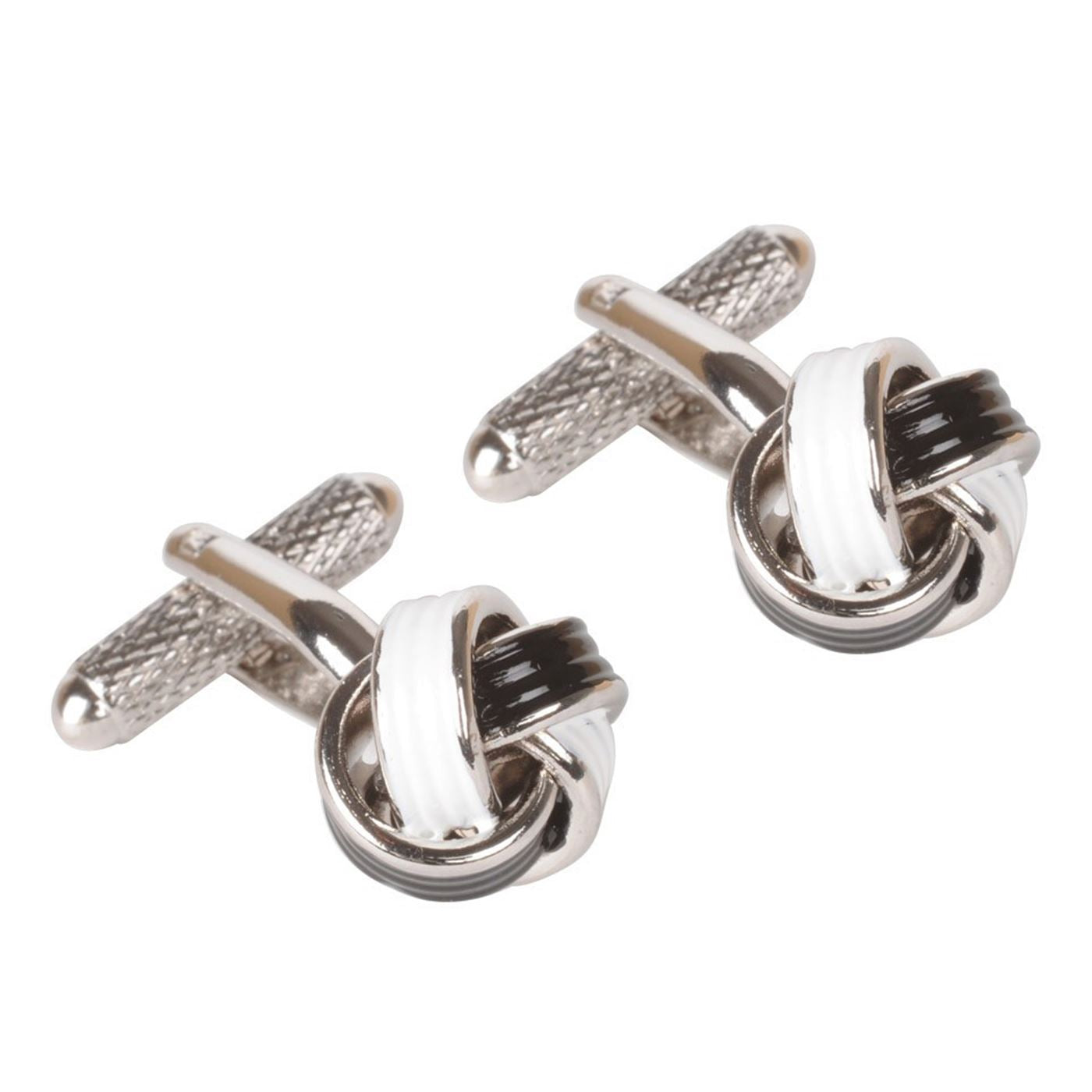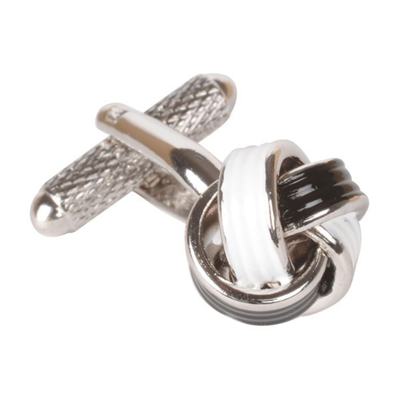 Black and White Knot Cufflinks. Black and White threads overlapping parallel to each other joined onto a strong swivel clasp. Rhodium metal and great detail shown throughout, a very nice design. Giftbox included in sale.