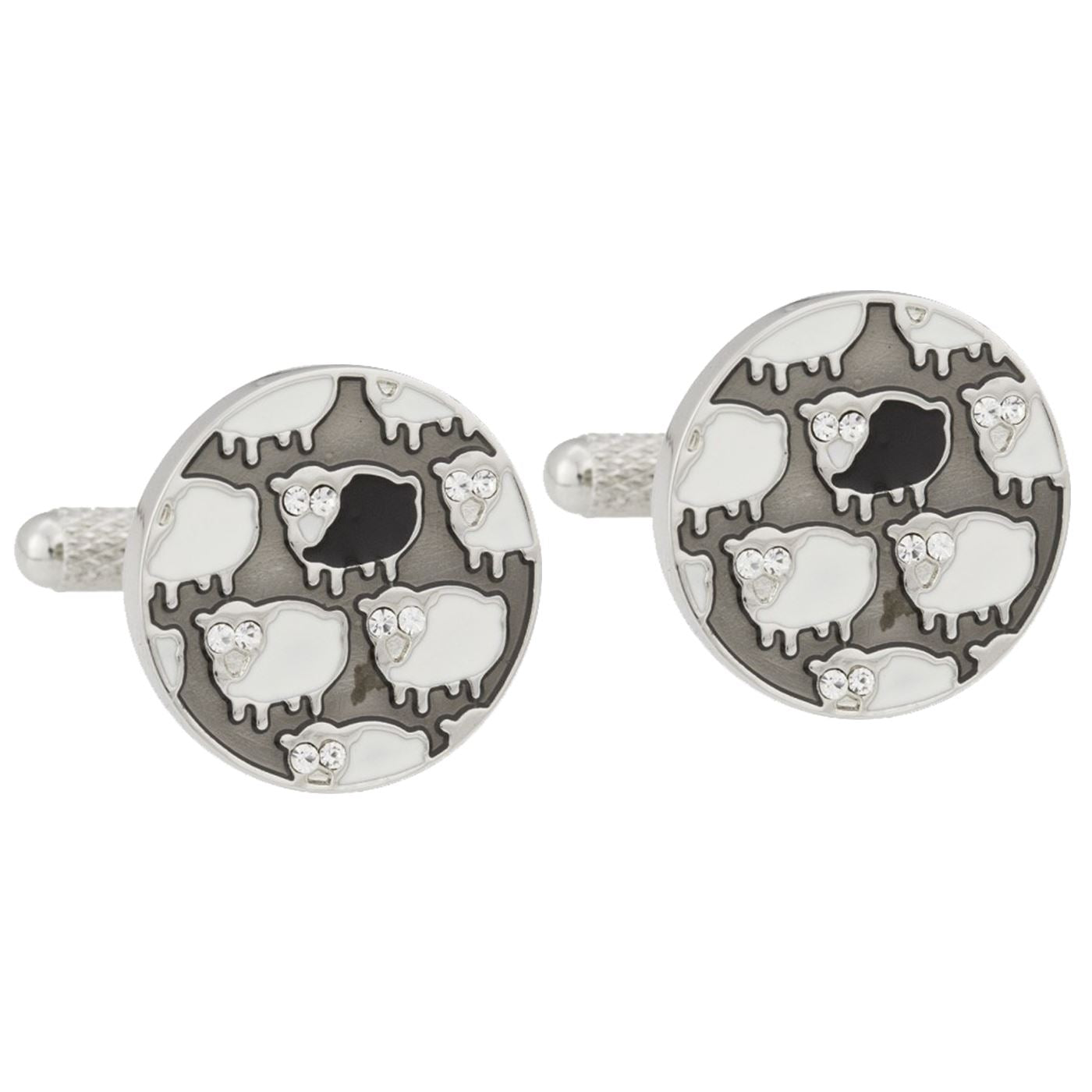 If you're the black sheep of the family or a farmer then these are the cufflinks for you! Polished rhodium cufflinks with white, grey and black enamel, white crystals as the sheep eyes and all set on a strong swivel clasp. Cufflink box included in sale.