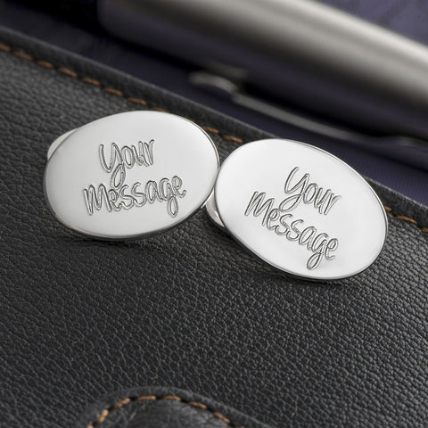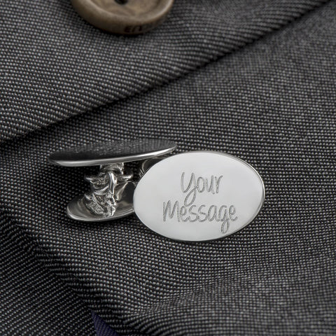 Sterling Silver Oval Chained Cufflinks, beautifully hand crafted and if your prefer the contemporary design then these genuine 925 sterling silver cufflinks are for you. Engrave up to 16 characters on each cufflink. Cufflink box included in sale.