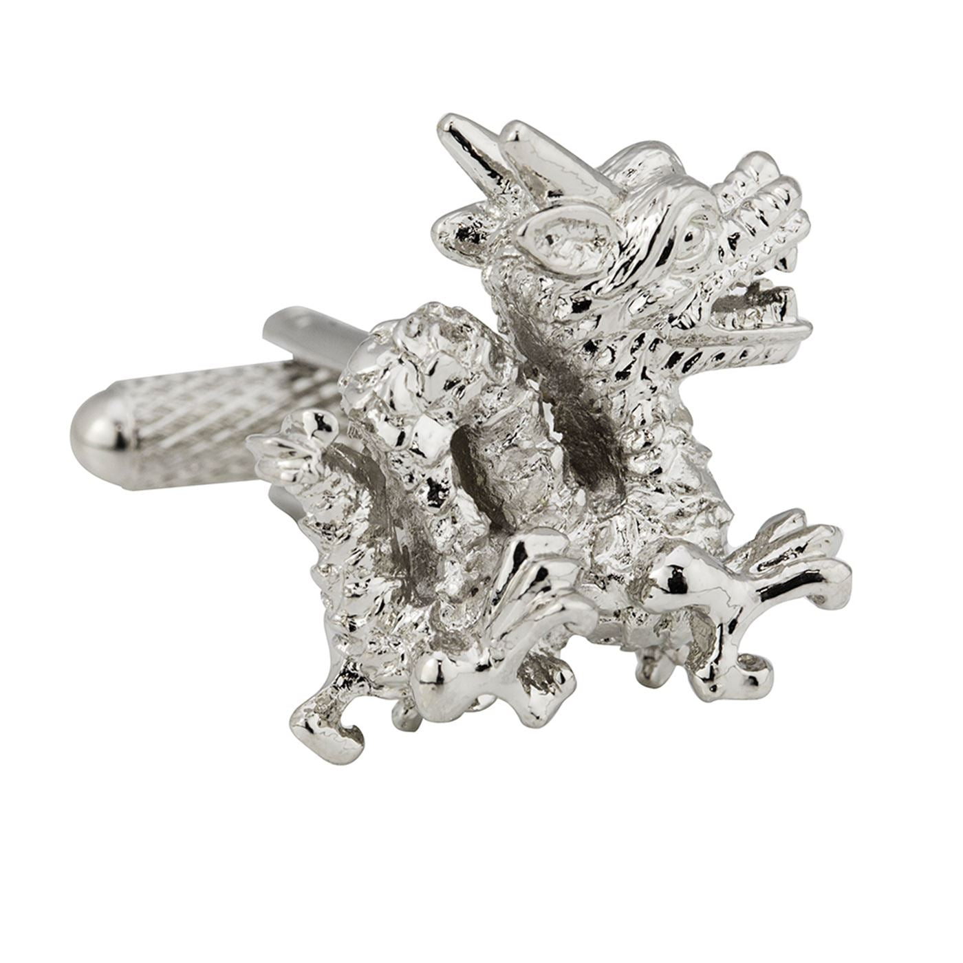 Polished rhodium plated chinese dragon cufflinks. Very detailed and a great addition to our novelty range. Cufflink box included in sale but you can also upgrade to an engraved giftbox if buying as a gift.