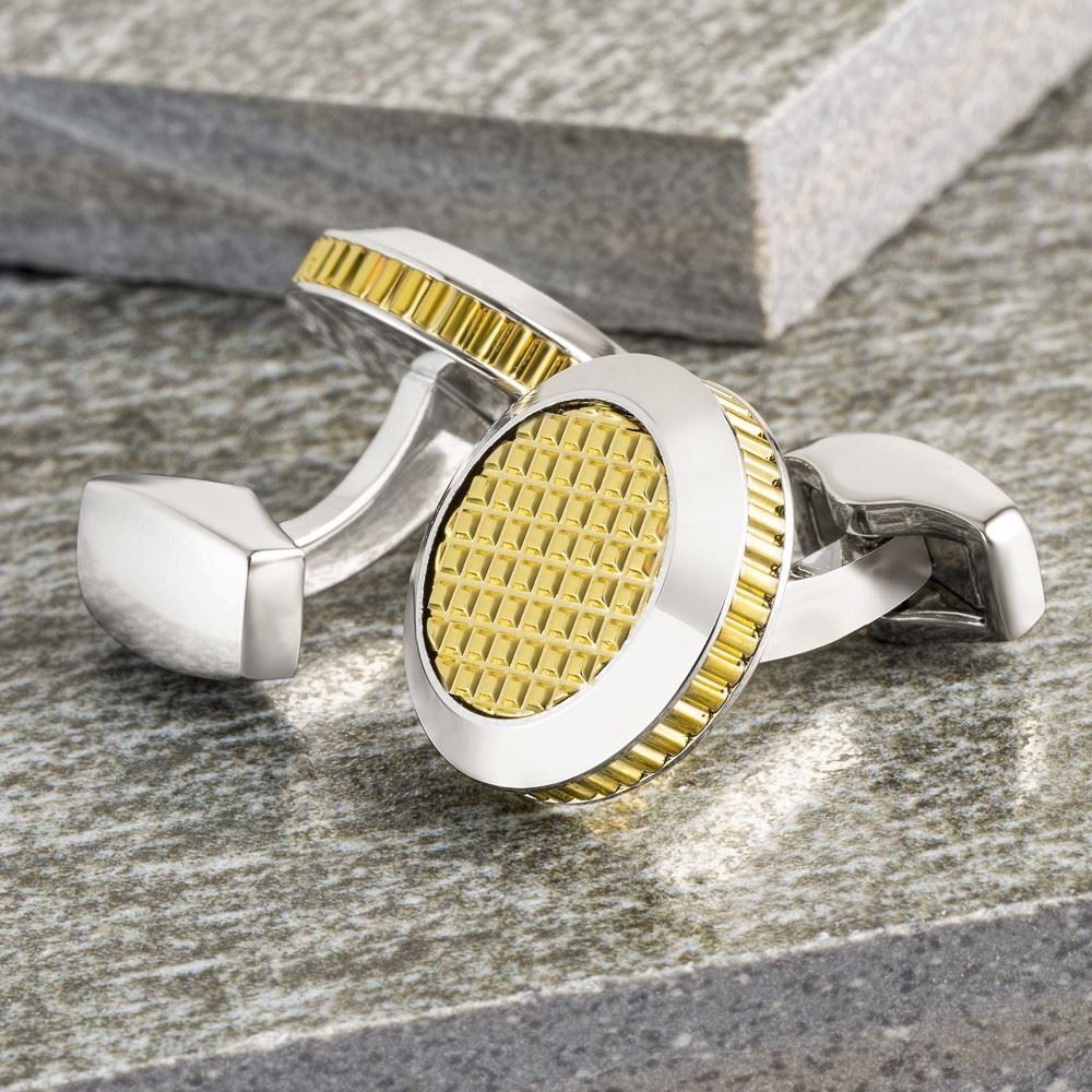 These executive silver and gold-plated cufflinks display a centred latticework design, and a textured, striped section to the side. A black faux-leather cufflink box is included in your purchase.
