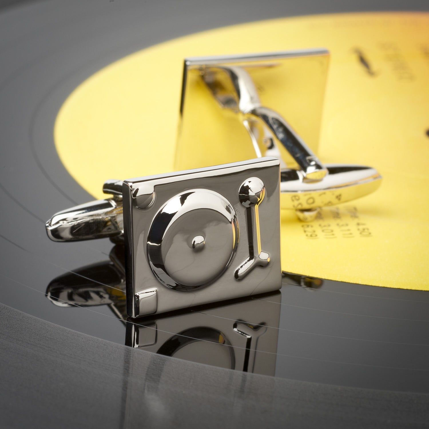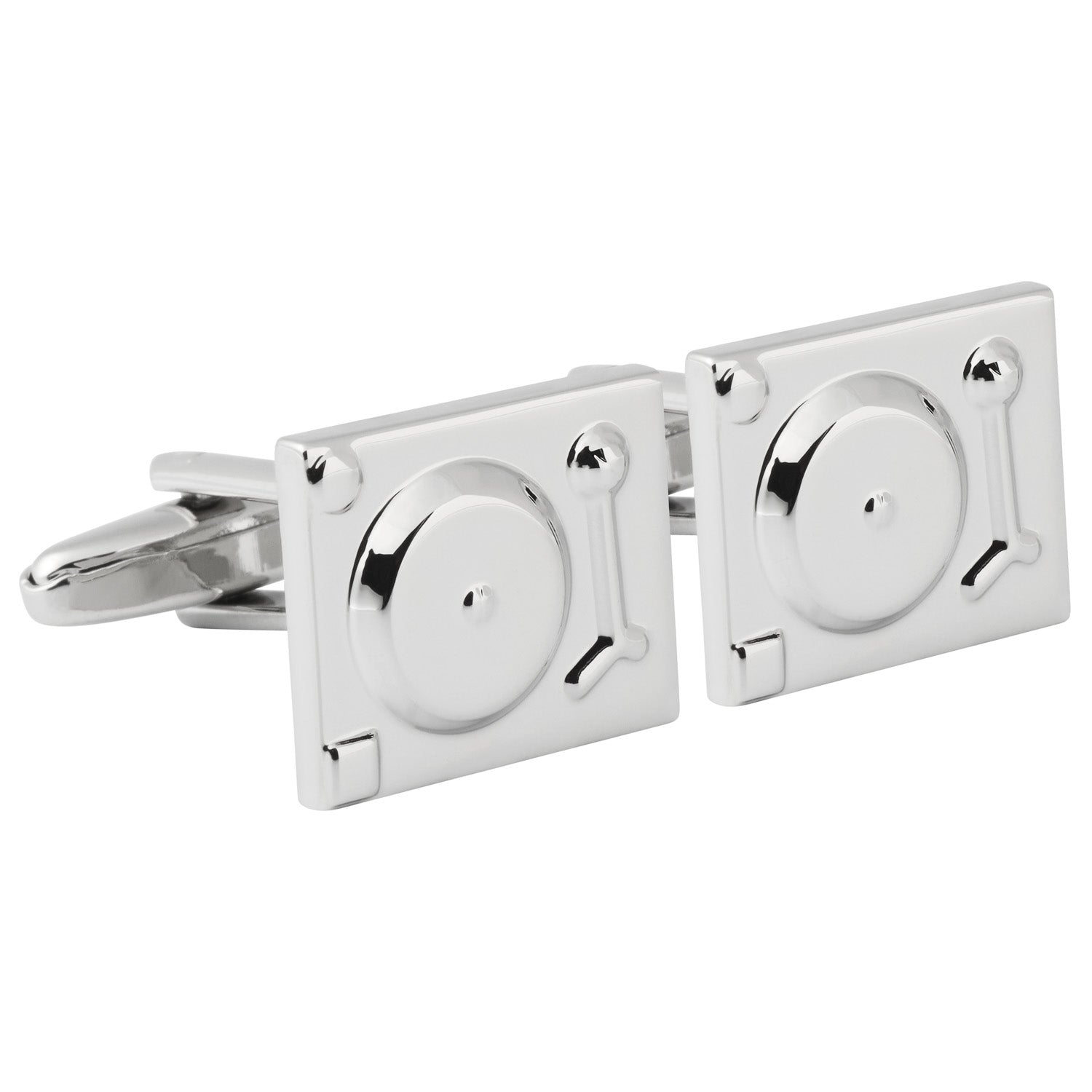 DJ Turntable cufflinks. Polished rhodium cufflinks set on a strong swivel clasp for easy use, hand crafted to show exceptional detailing. Cufflink box included in sale but if you're buying as a gift why not upgrade to an engraved giftbox to include a special message.