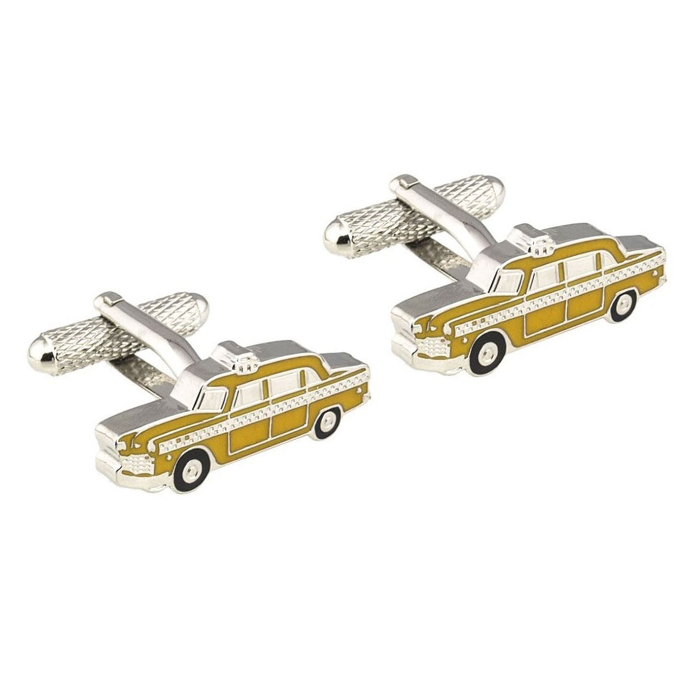 Yellow cab cufflinks, new to our novelty range. Polished rhodium plated cufflinks set on a strong swivel clasp with yellow enamel. Fantastic detailing, perfect for any cab or taxi driver. Cufflink box included in sale.