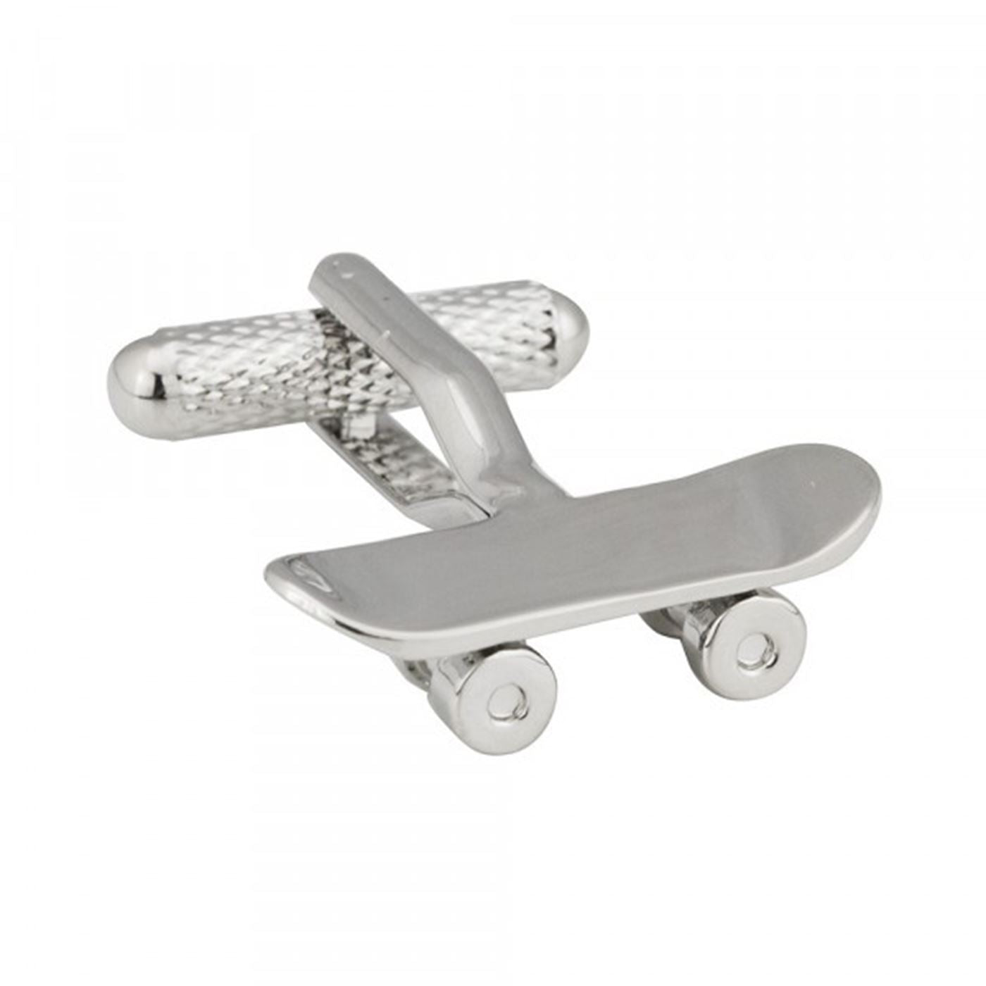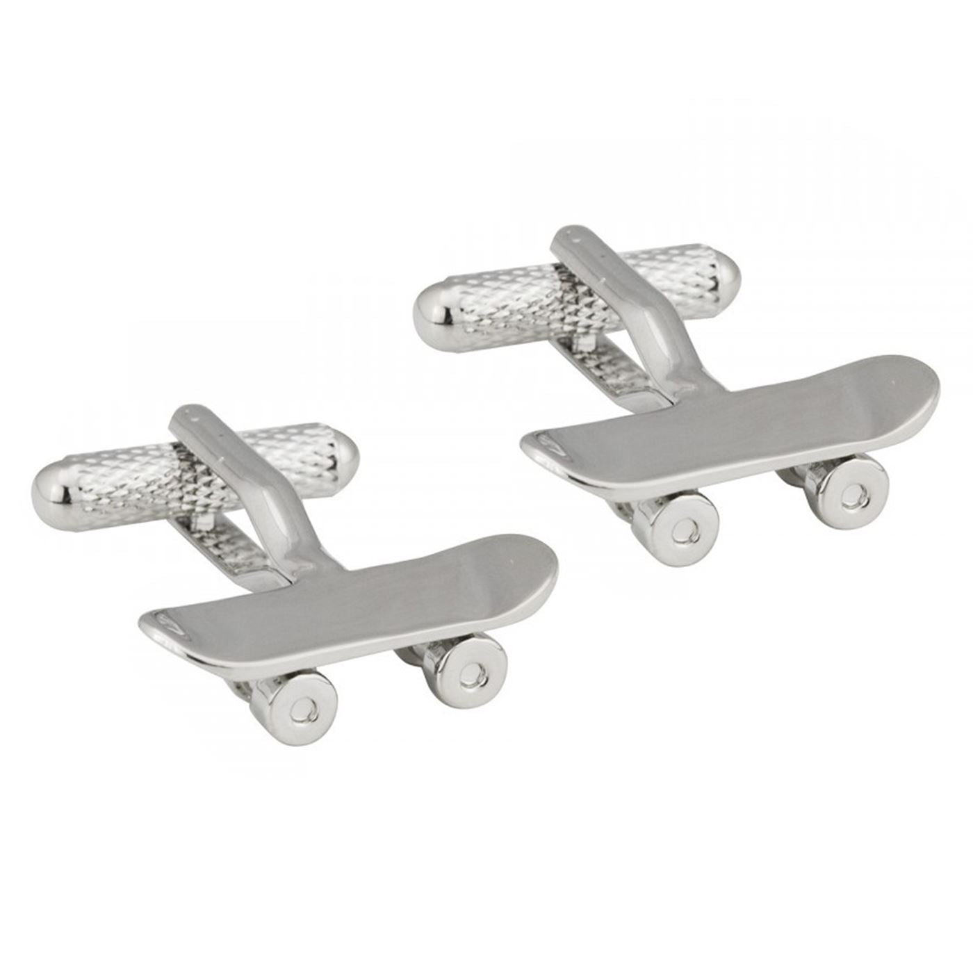 Rhodium plated skatebaord cufflinks. Fine detailing shown throughout and set on a strong swivel clasp for ease of use. Cufflink box included in sale.