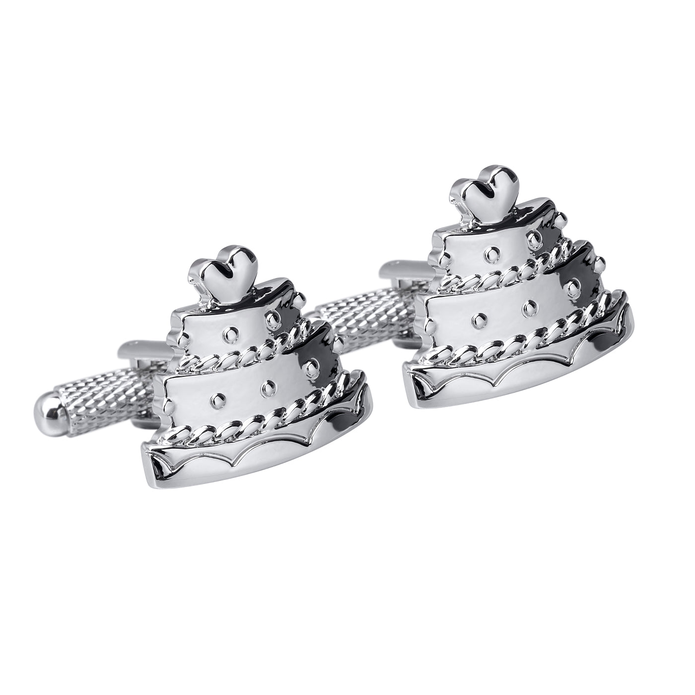 Polished rhodium wedding cake cufflinks. Detailed pair of cufflinks set on a strong swivel clasp. Cufflink box included in sale but if buying as a gift you can upgrave to an engarved giftbox to include a special message.