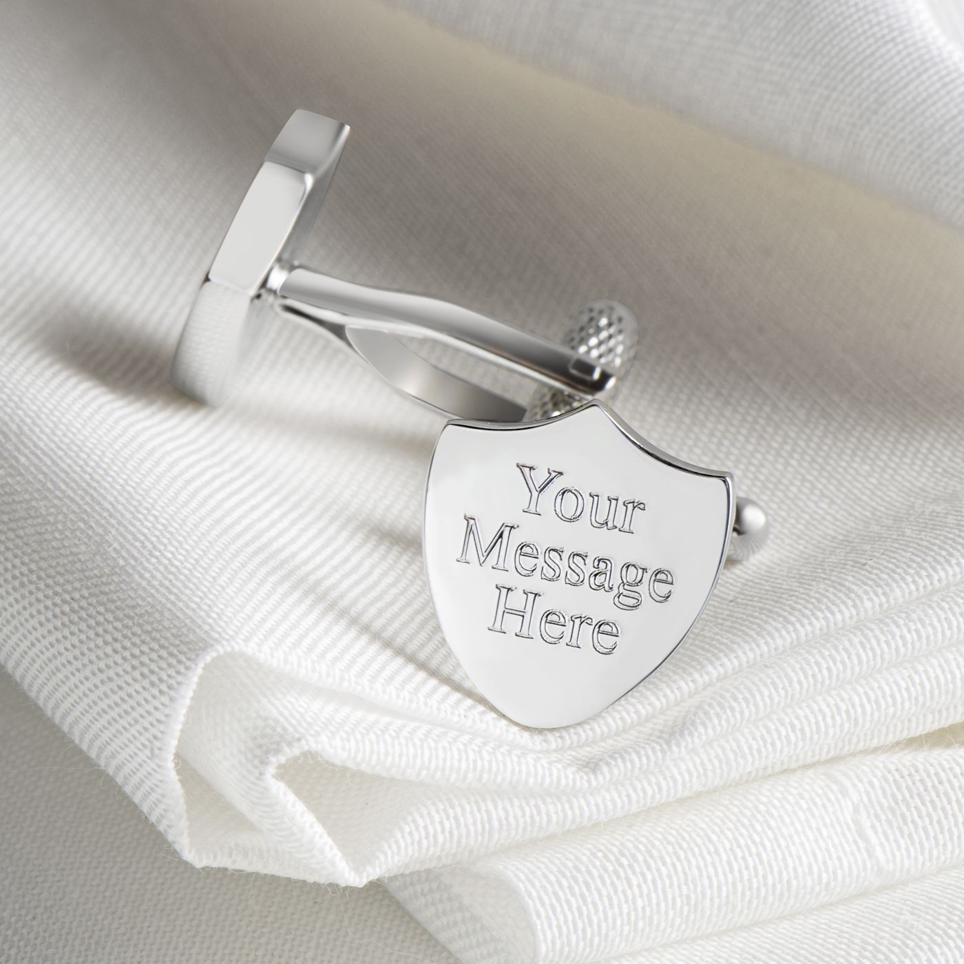 Luxury silver plated shield cufflinks that can be engraved to your specification. Engrave up to 30 characters on each cufflink to make a fantastic personalised gift. Hand engraved by our own professional engraver. Cufflink box included in sale but you can also upgrade to an engraved giftbox to include a special message!