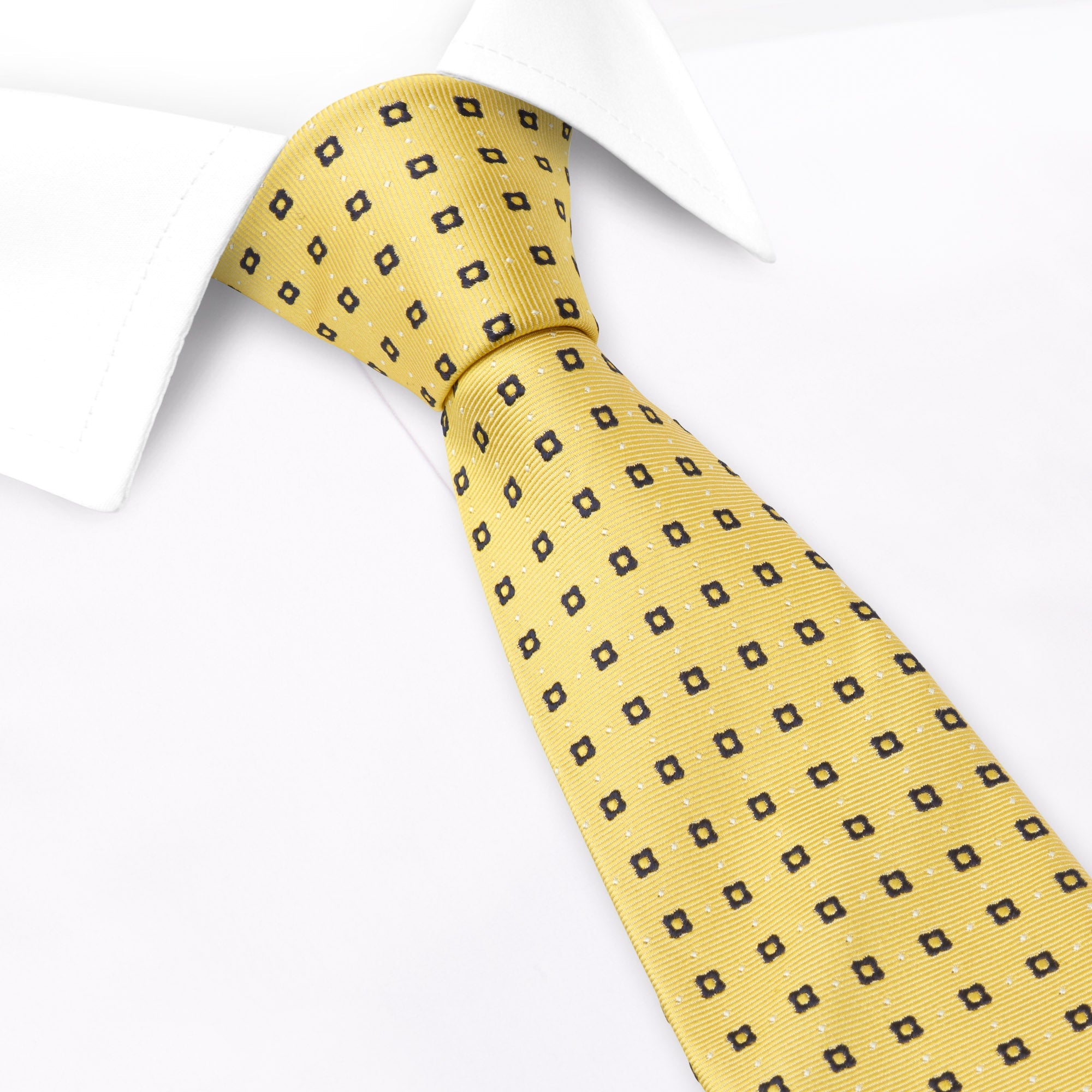 Yellow and Navy Flower Spot Silk Tie - Each Tie Store tie is made using the finest woven silk and hand finished to perfection. This tie is best worn with a classic or cut away collared shirt. Dimensions: 8.0cm x 148cm 100% Silk