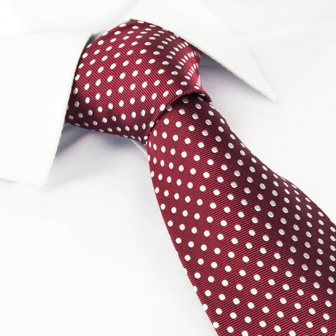Dark Red Polka Dot Woven Silk Tie Luxury red polka dot woven silk tie, suitable for both business and special occasions. The 100% woven silk gives the tie a more textured look, fantastic quality shown throughout. 100% Silk Dimension: 8.0cm x 148cm