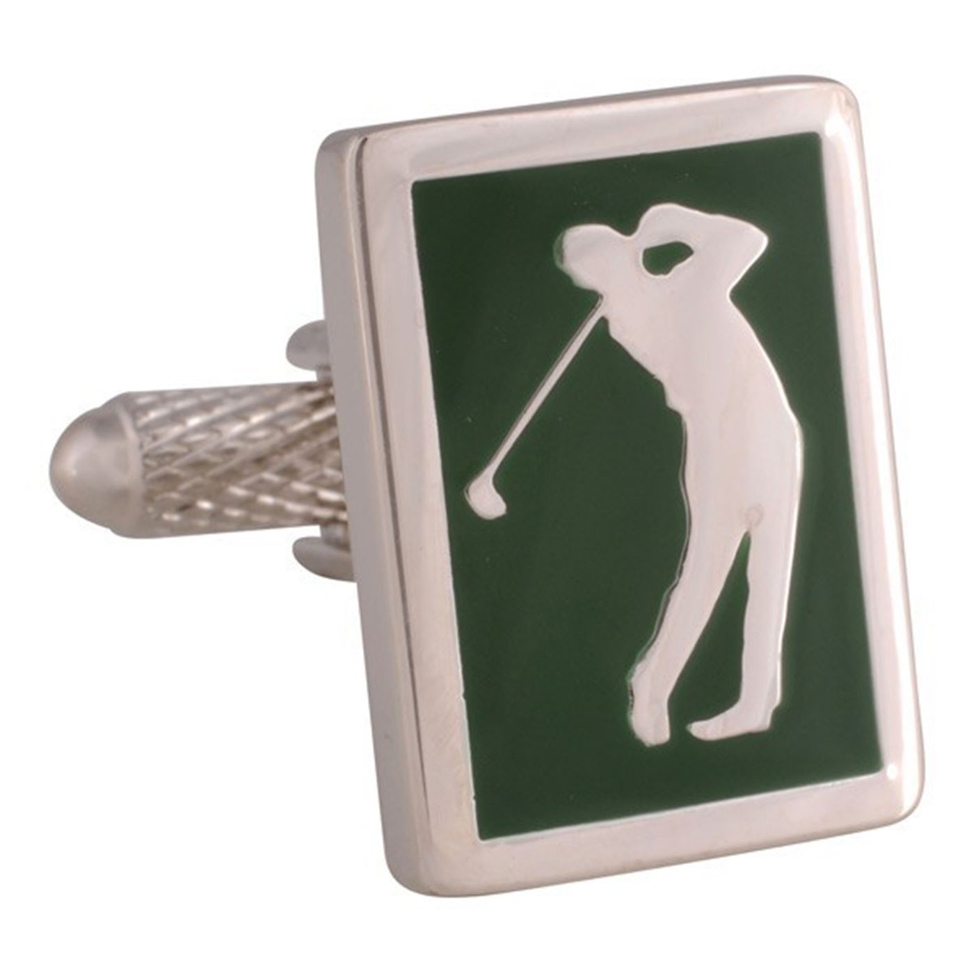 Rhodium golfer cufflinks with a dark green enamel background set on a strong swivel clasp. Exceptional quality shown throughout, cufflink box included in sale  Dimensions - 14mm x 19mm