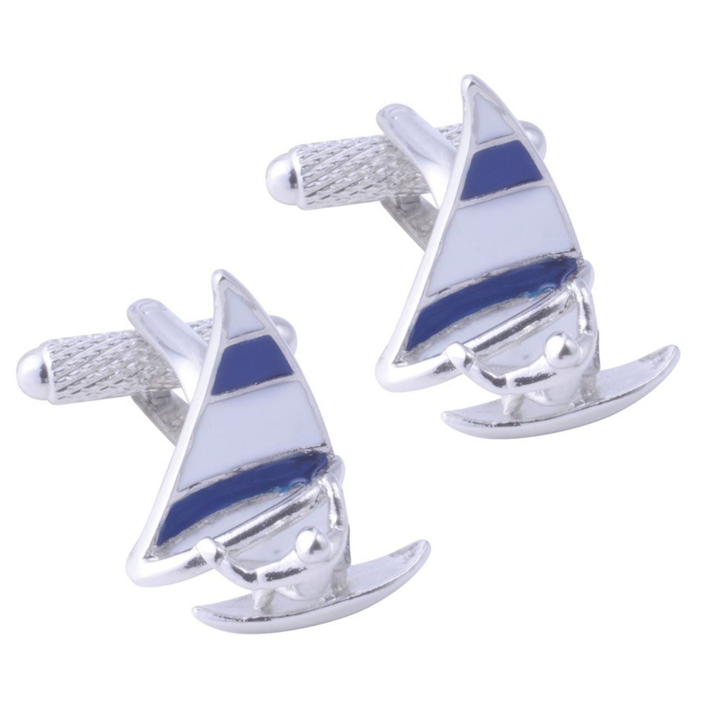 Windsurfing cufflinks. Highly polished rhodium plated cufflinks with blue and white enamel. Hand crafted to very fine detail these cufflinks are perfect for anyone associated with windsurfing. Cufflink box included in sale but if buying as a gift why not upgrade to an engravable giftbox to include a special message! Dimensions - 20mm x 13mm