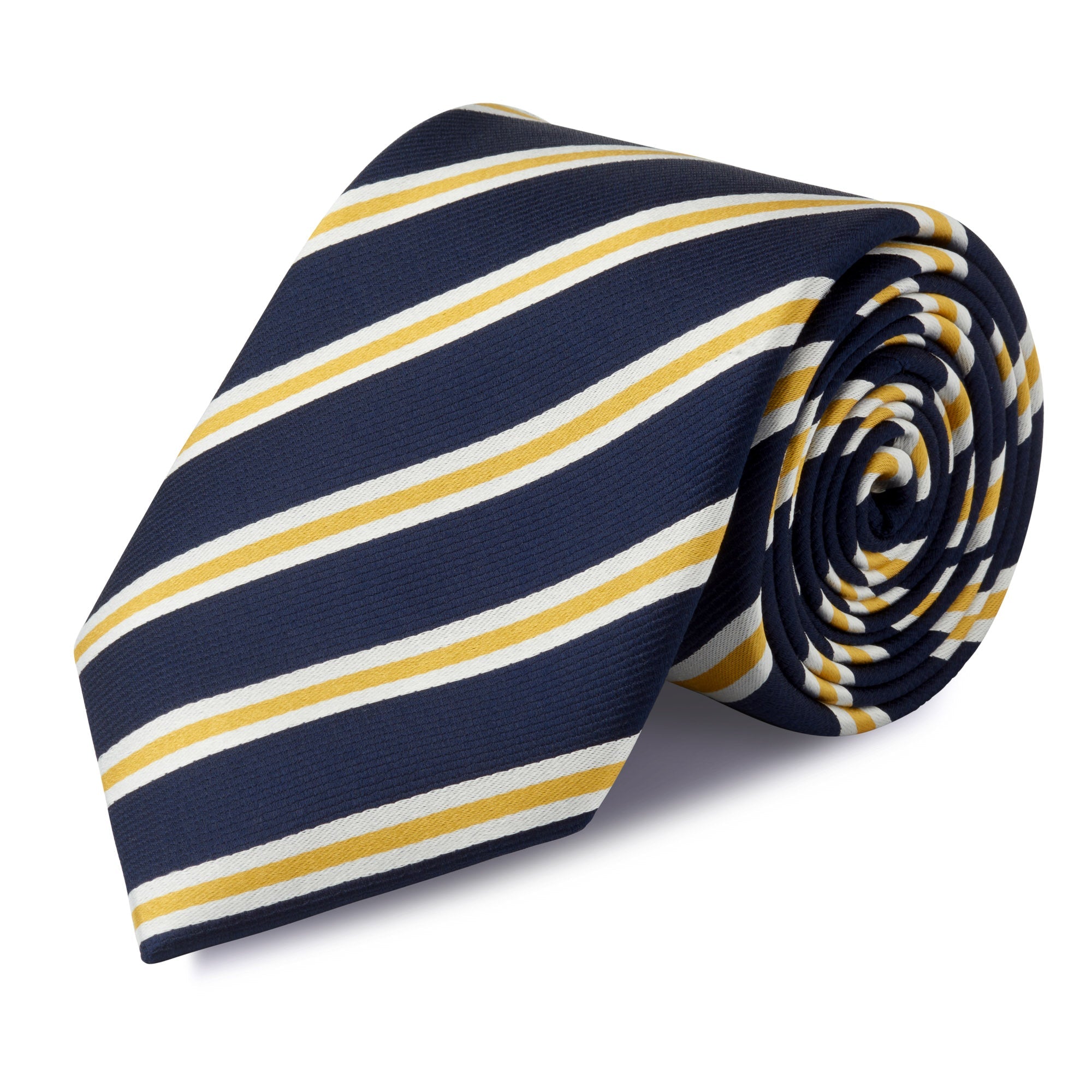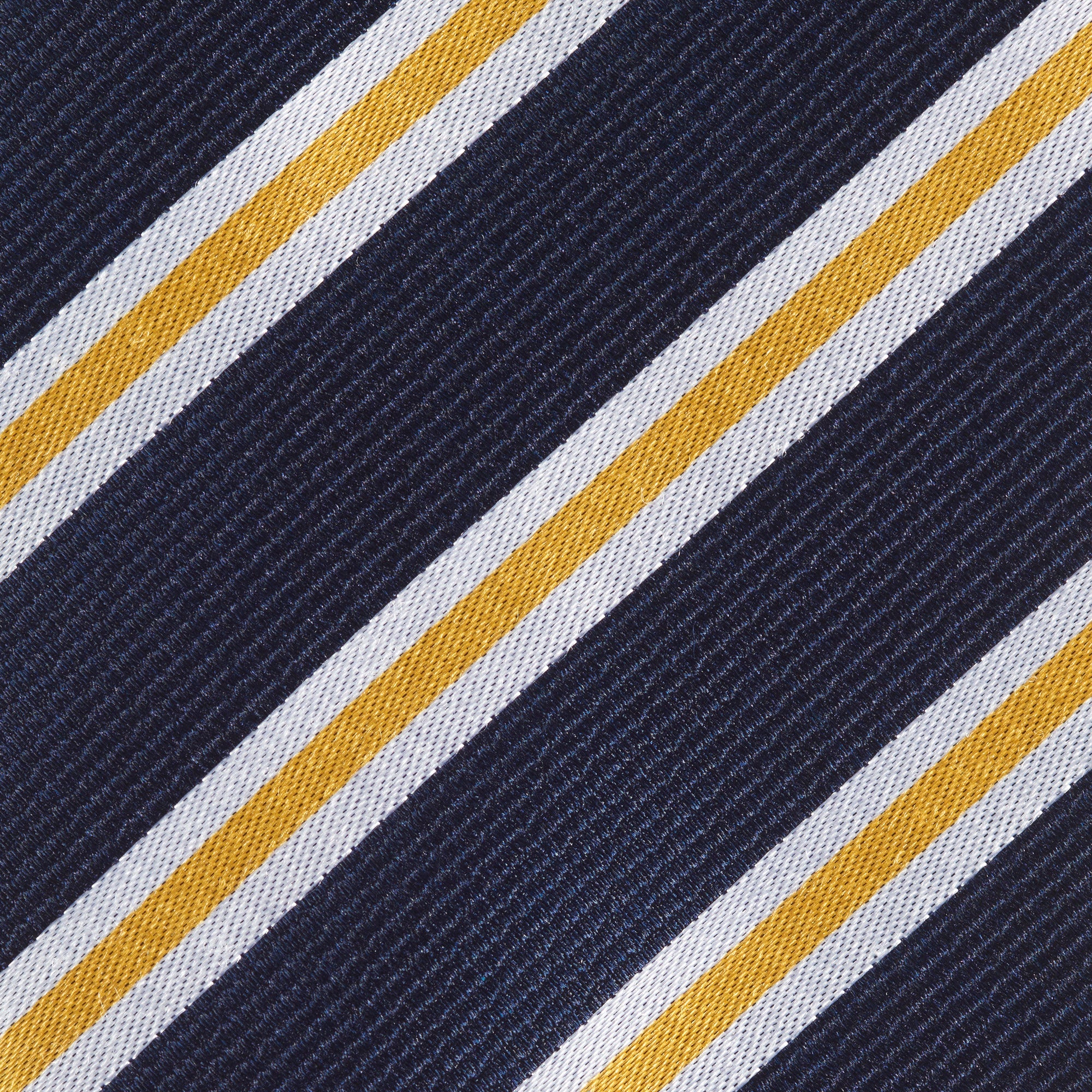 Navy With White And Gold Stripes Silk Tie - Luxury navy satin silk tie with white and gold stripes, suitable for both business and special occasions. The 100% woven silk gives the tie a more textured look, fantastic quality shown throughout. 100% Silk Dimension: 8.0cm x 148cm