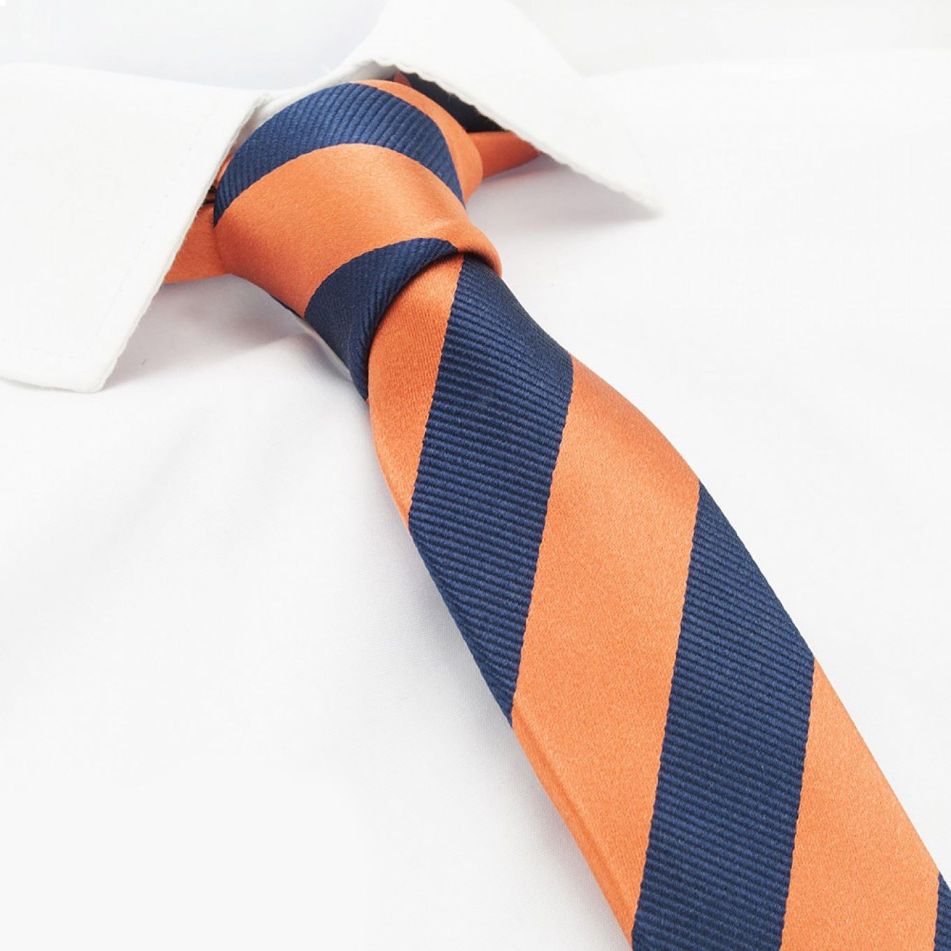 Orange and Navy Woven Striped Silk Tie Add some stripes to your smart wardrobe with this classic staple.Featuring a 100% woven silk striped design, this is a great value tie that can be worn year after year. 100% Silk Dimension: 5.5cm x 148cm
