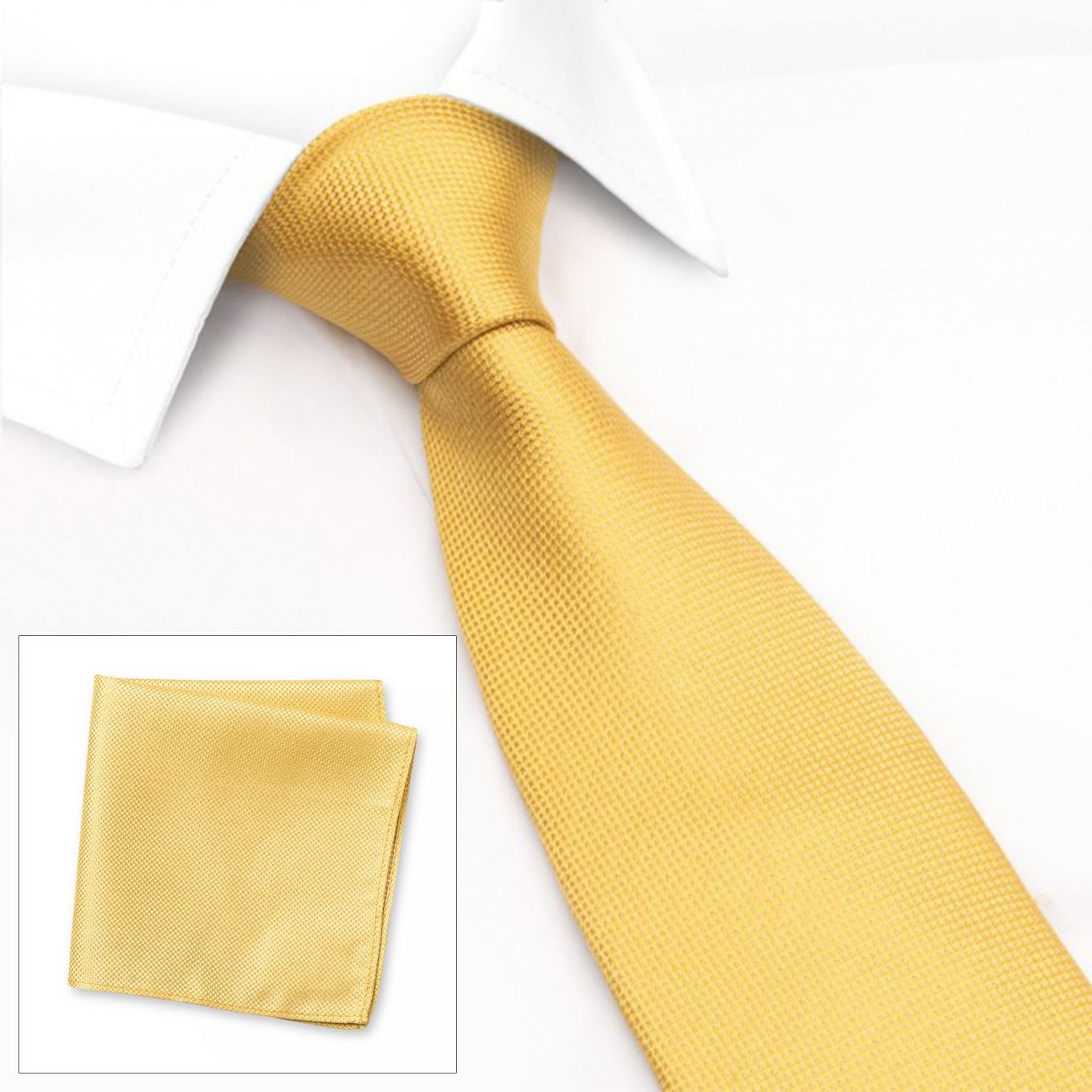 Pale Gold Silk Plain Classic Textured Tie and Handkerchief Set Add some texture to your smart dress collection with this matching classic woven silk tie and handkerchief set finished in pale gold. Perfect for weddings, special occasions or everyday business wear. Made using 100% Woven Silk Tie Dimensions: 8.0cm x 148cm Handkerchief Dimensions: 25cm x 25cm