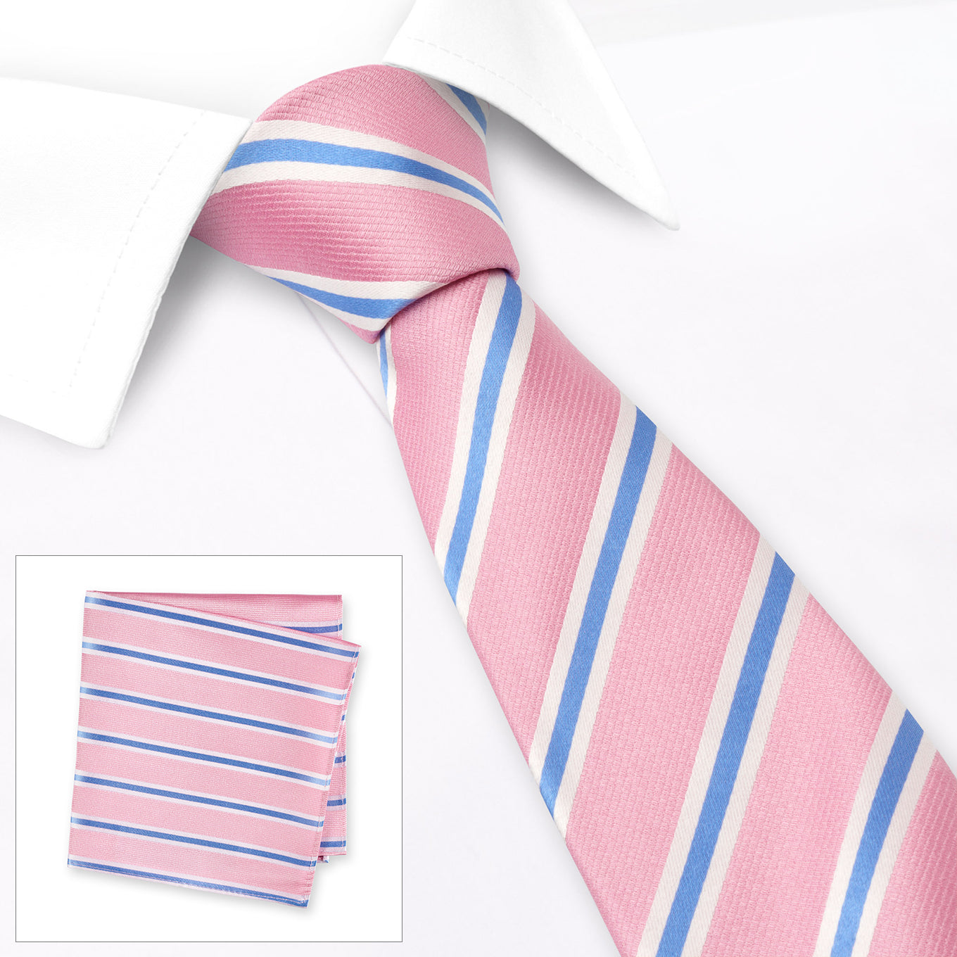 Pink Woven Silk Tie with Blue and White Stripes Silk Tie & Handkerchief Set