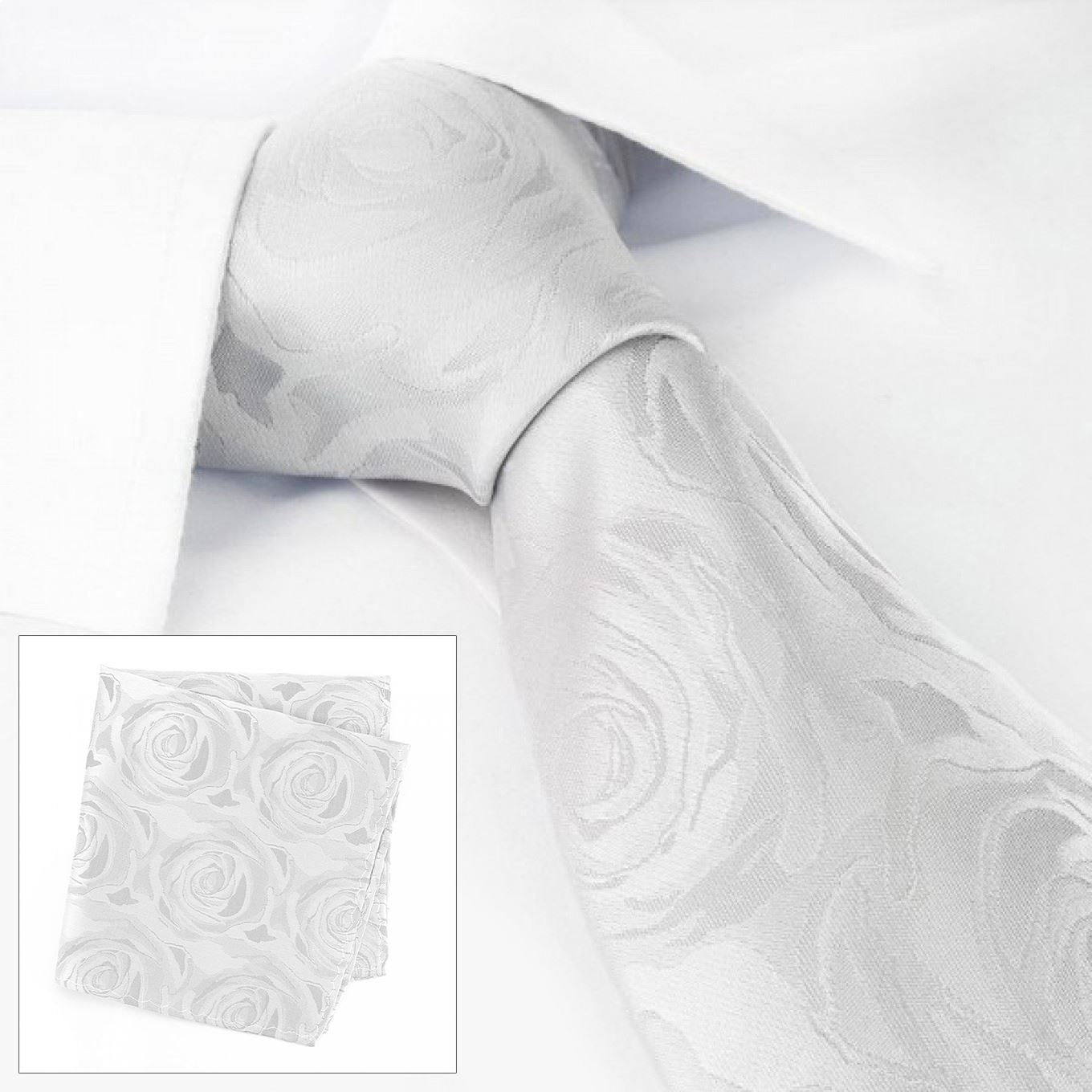 Silver Rose Luxury Woven Silk Tie and Handkerchief Set - Made using 100% fine silk, this beautiful matching tie and handkerchief set is hugely popular for weddings and special occasions. Tie Dimensions: 8.0cm x 148cm Handkerchief Dimensions: 30cm x 30cm