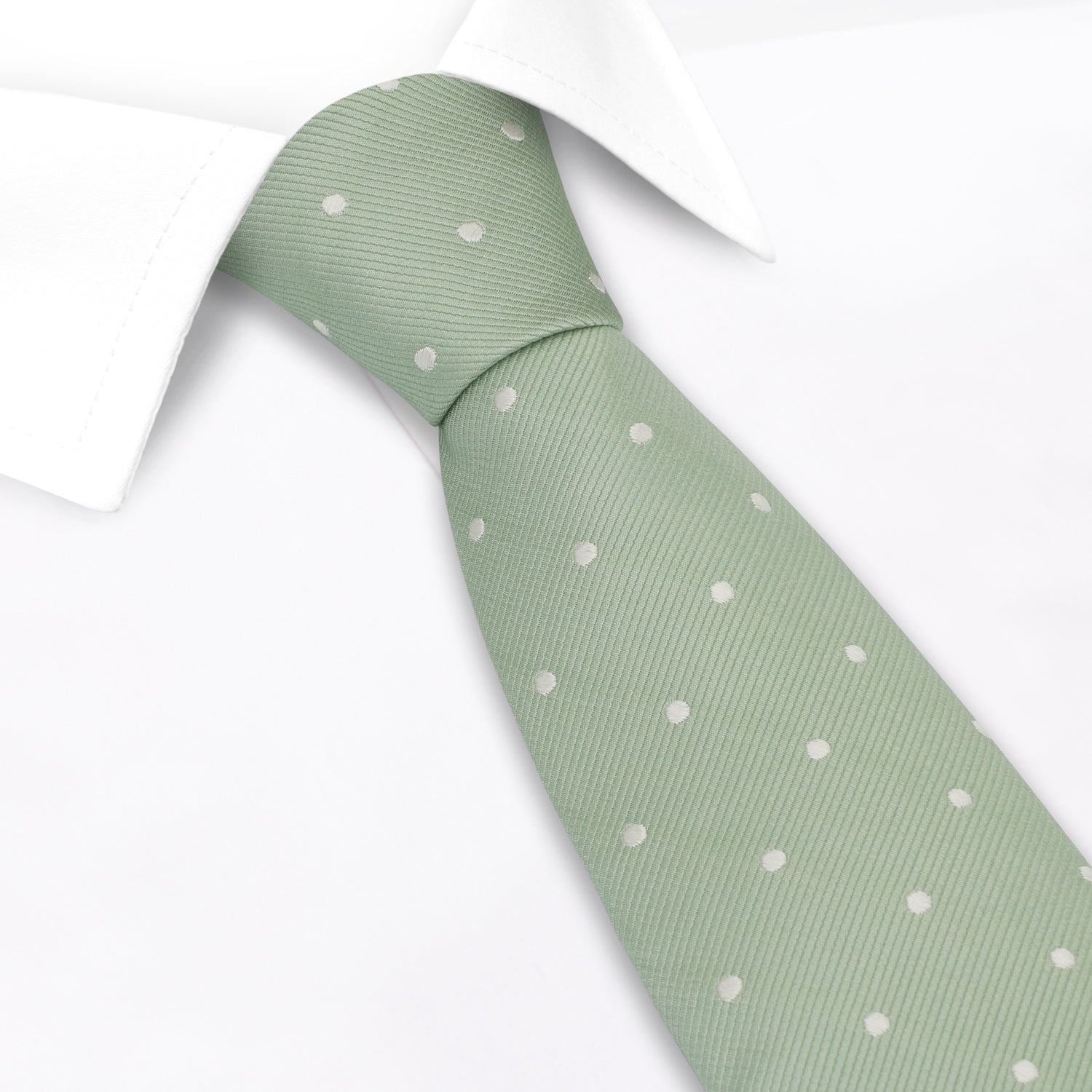 Yoghurt Green Polka Dot Silk Tie This classic polka tie is a great addition to your tie collection. Made using 100% luxury woven silk and featuring a timeless spotted design. 100% Silk Dimensions: 8.0cm x 148cm