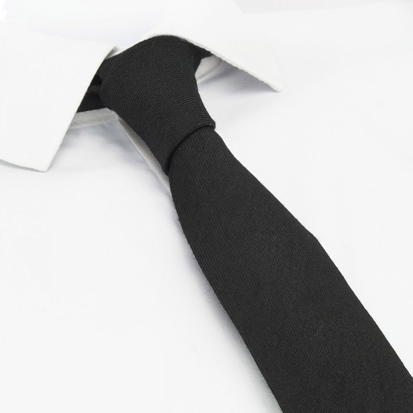 Plain Black Wool Mix Slim Tie Created using a 50/50 blend of Wool and Polyester and featuring a textured finish.Perfect for Weddings, special occasions or every day work wear. 50% Wool / 50% Polyester Dimension: 5.5cm x 149cm