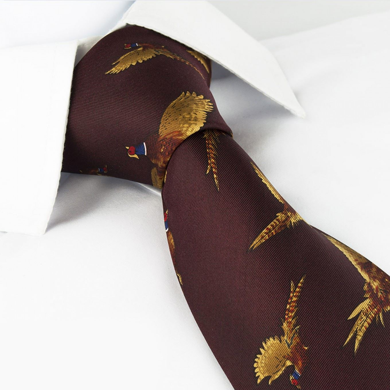 Flying Pheasant Country Silk Tie This luxury wine flying pheasant silk tie would make the perfect gift for any bird lover. Suitable for business or just casual wear. The 100% silk gives the tie a more textured look, fantastic quality shown throughout. 100% Silk Dimension: 8cm x 149cm